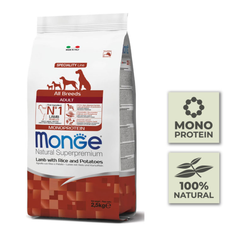 Monge Natural Superpremium Specialty Line Adult Croquetas con Cordero, Arroz y Patatas son un alimento completo y equilibrado para perros adultos de todas las razas que necesitan alimentos de alta digestibilidad.