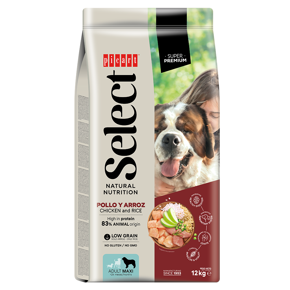 Picart Select ADULT MAXI con pollo y arroz está formulado con postbióticos que ofrecen beneficios para la salud digestiva y el sistema inmunitario, contribuyendo a su bienestar general.